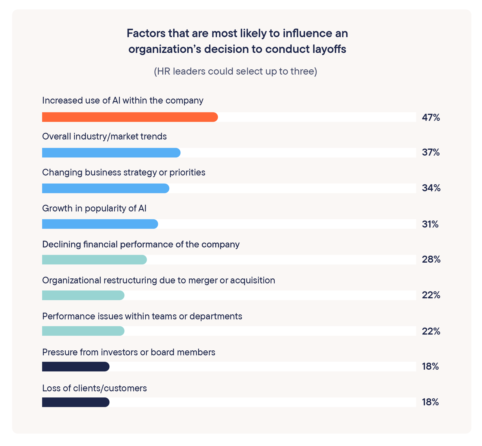 Nearly 6 in 10 (57%) HR leaders say their organization is likely to conduct layoffs in the next 12 months, and almost half this group (47%) say increased use of AI is the main factor. Employees, on the other hand, report high confidence in job security. This gap highlights a disconnect between leadership expectations and employee perceptions, increasing the risk of complacency and emerging skill gaps.