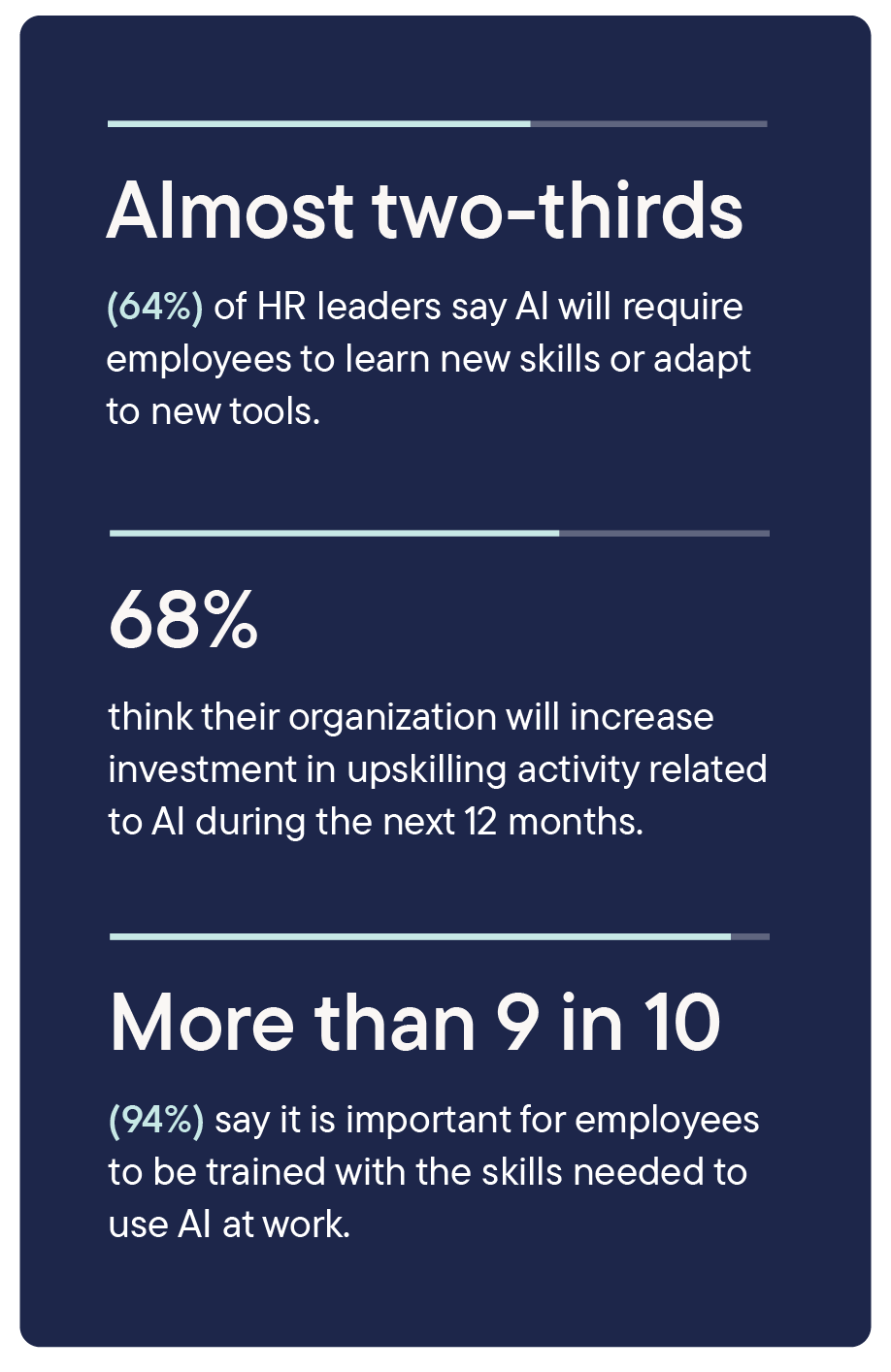 With roles changing faster than many employees expect, employers can’t rely on people staying in fixed positions. Two-thirds (64%) of HR leaders say AI will require employees to learn new skills or adapt to new tools. Our research shows how skill security is replacing traditional job security, making continuous learning and development essential. Human skills such as critical thinking, problem-solving, and adaptability remain central to success.